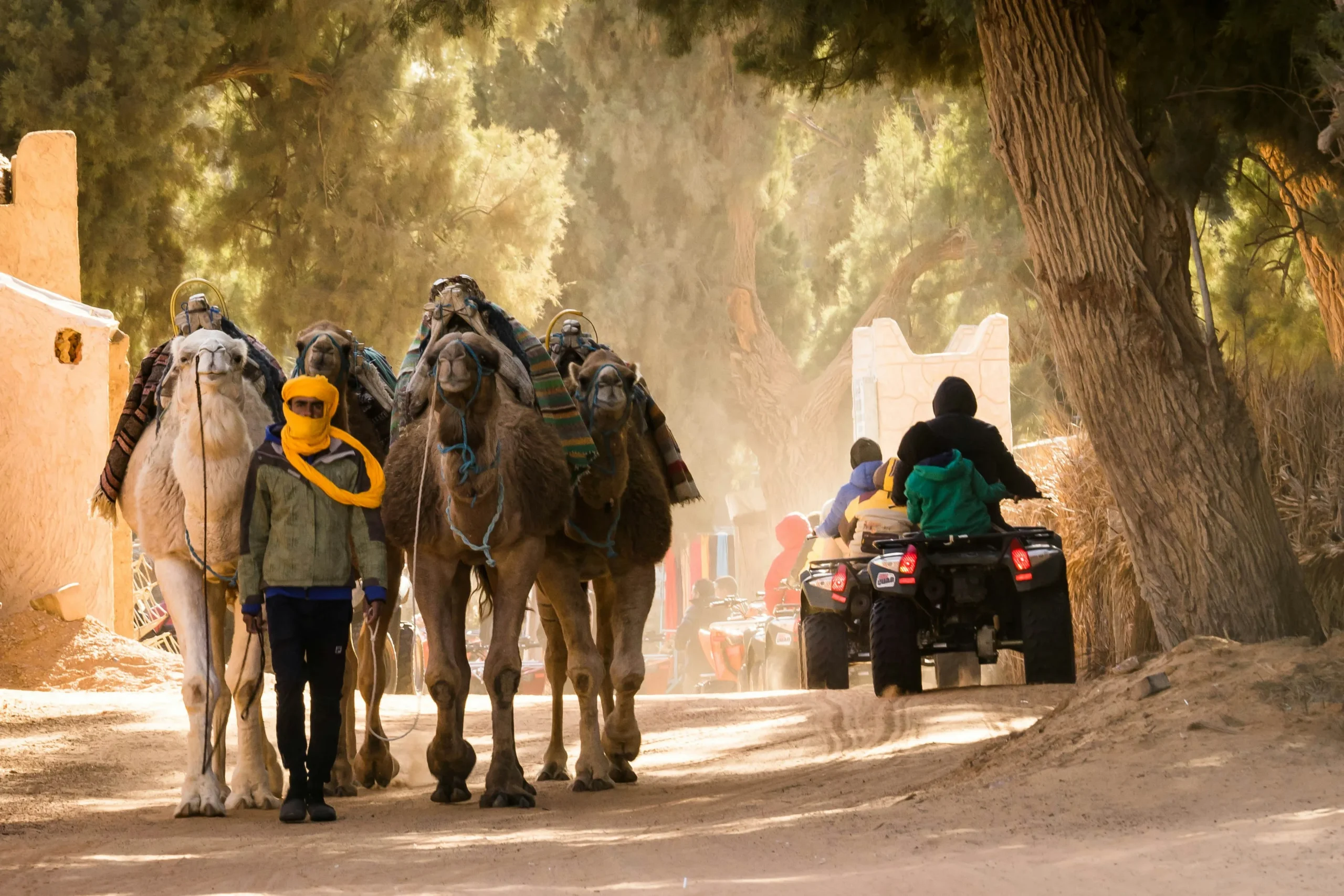 Nous rejoignons Douz, la porte du désert. Montés sur nos dromadaires, nous traversons les dunes orangées au rythme lent des caravanes. Un moment magique au cœur du Sahara, suivi d’un coucher de soleil inoubliable dans le silence doré.